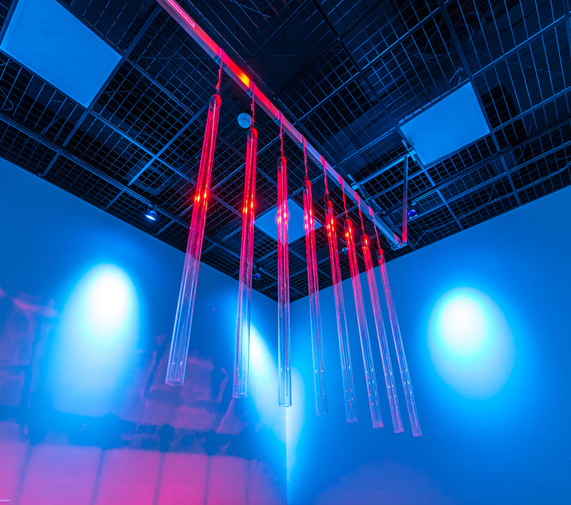 Hanging acrylic tubes containing bead-chain generate acoustic impulses that trigger and control the synthetic sounds present in this piece. Each tube has a contact microphone embedded in its cap, and when a tube is tapped or shaken the vibrations are transmitted to a computer running custom signal processing software. Several types of sound generating algorithms are employed, including granulation, wavelet synthesis, rotating variable delay, formant synthesis, spectral reverb, and additive synthesis. The contact microphones afford expressive control of these sounds by providing a wide range of input sounds that are mapped directly to various parameters of the synthesis algorithms.